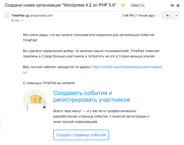 Однако, важно знать, что даже при создании события через API пользователю будут приходить на email системные нотификации от TimePad (в том числе подтверждения создания событий, списки участников, нотификации о продажах билетов и другие). При этом все ссылки из писем будут вести на учетную запись организатора в домене timepad.ru