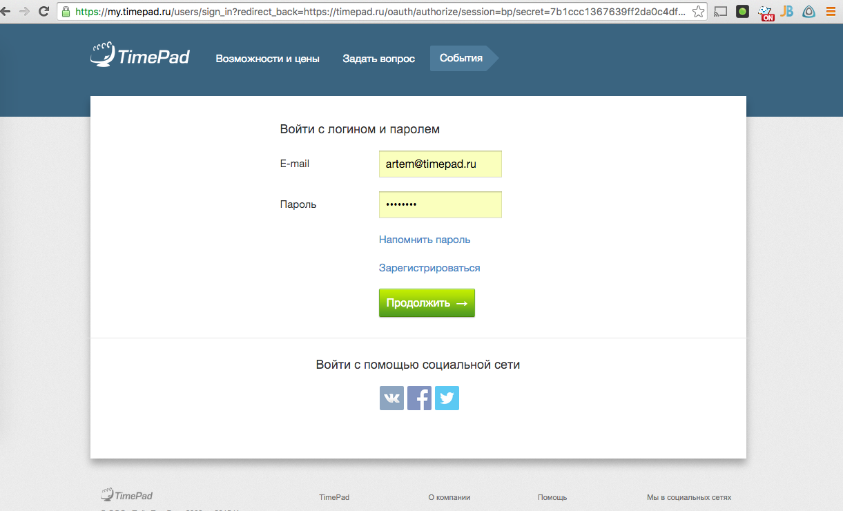 После нажатия на кнопку пользователь будет переброшен на стандартную страницу авторизации TimePad. Если у пользователя нет аккаунта на TimePad он может нажать на одну из кнопок соцсетей и привязать свой новый аккаунт к аккаунту из соцсети - для этого даже не нужно придумывать пароль и вводить свой вдрес электронной почты:
