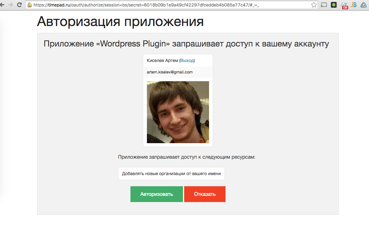 Как это выглядит в плагине для WordPress: при пустом списке организаций мы автоматически создаем на TimePad аккаунт с именем, равным имени блога и все события постим в эту организацию. То есть пользователю после регистрации не нужно ничего делать, все делается за него.