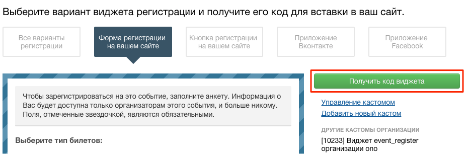 1. Зайдите на страницу управления событием, для которого вы хотите взять виджет регистрации. В боковой колонке вы найдете код регистрации. Нажмите кнопку «Получить код».